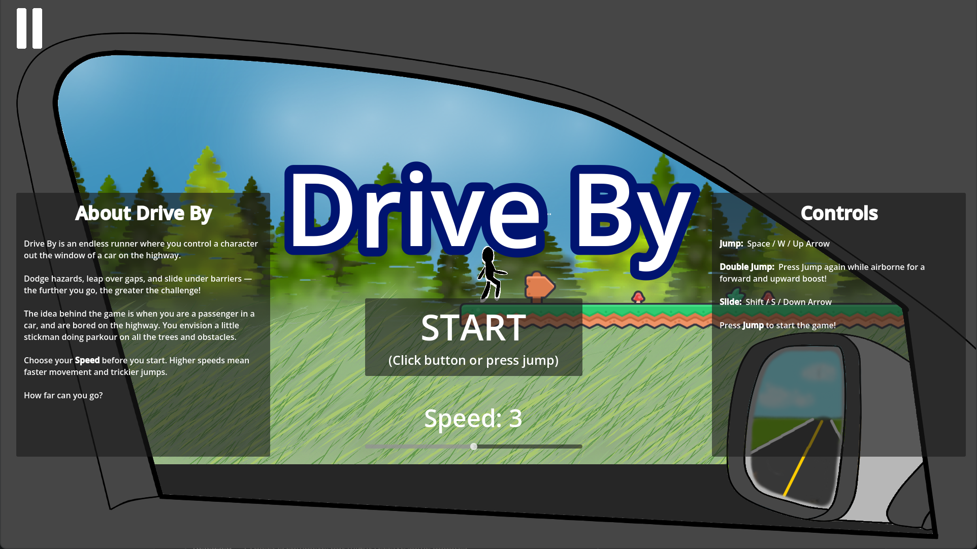 The idea behind the game is when you are a passenger in a car, and are bored on the highway. You envision a little stickman doing parkour on all the trees and obstacles.